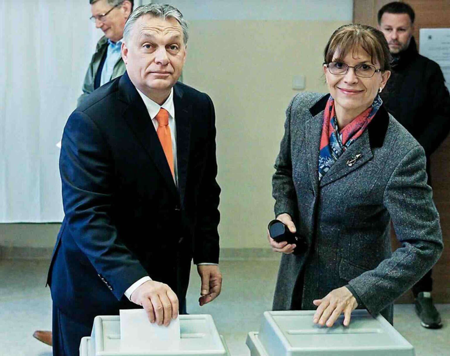 Foto af Viktor Orbán og Anikó Lévai ved valget i 2018 – © Alexey Vitvitsky / RIA Novosti, CC BY-SA 3.0, via Wikimedia Commons.